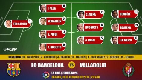 En el once contra el Valladolid, Jordi Alba y Sergi Roberto ocuparán los laterales, mientras que la pareja de centrales estará formada por Piqué y Vermaelen y, en el centro del campo, Arturo Vidal volverá a ser la novedad para sustituir a Arthur, con Busquets y Aleñá. Dembélé, Leo Messi y Boateng formarán el frente de ataque, con un Luis Suárez que se quedará en el banquillo pero podría tener minutos en el segundo tiempo.