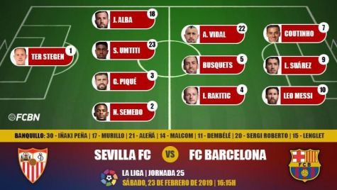 En el once contra el Sevilla, Jordi Alba y Semedo ocuparán los laterales, mientras que la pareja de centrales estará formada por Piqué y Umtiti y, en el centro del campo, Arturo Vidal será la novedad para sustituir a Arthur, con Busquets y Rakitic. Coutinho, Leo Messi y Luis Suárez formarán el frente de ataque, con un Dembélé que se quedará en el banquillo pero podría tener minutos en el segundo tiempo, al igual que Malcom.