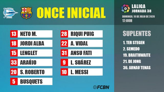 • XI del FC Barcelona: Neto; S. Roberto, Araújo, Lenglet, Jordi Alba; Busquets, Riqui Puig, A. Vidal; Messi, Ansu y Luis Suárez.