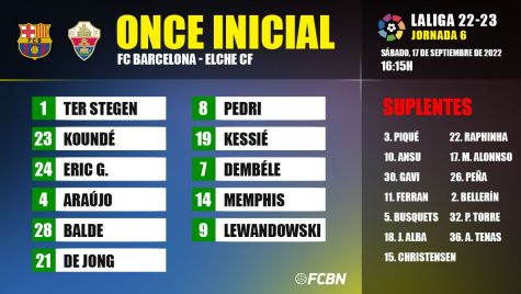 Xavi Hernández ya ha revelado la alineación con la que el FC Barcelona enfrentará al Elche en la sexta jornada de LaLiga Santander 2022-2023. Este es el XI del Barça: Ter Stegen; Koundé, Araújo, Eric, Balde; De Jong, Pedri, Kessié; Memphis, Lewandowski y Dembélé