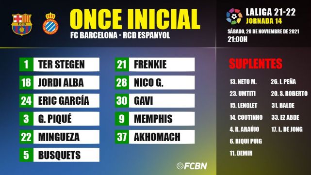 - XI del FC Barcelona: Ter Stegen; Jordi Alba, Piqué, Eric, Mingueza; Busquets, Nico, Frenkie; Gavi, Memphis y Akhomach.
