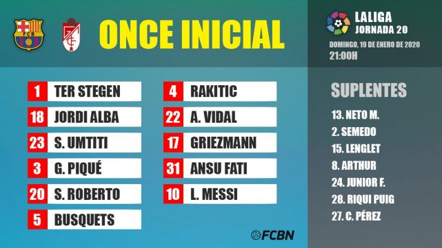 - XI del FC Barcelona: Ter Stegen; S. Roberto, Piqué, Umtiti, Jordi Alba; Busquets, Rakitic, Arturo Vidal; Griezmann, Messi y Ansu Fati.
