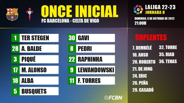 Xavi Hernández ya ha revelado la alineación con la que el FC Barcelona enfrentará al RC Celta de Vigo por la octava jornada de LaLiga Santander 2022-2023. Este es el XI del Barça: Ter Stegen; Balde, Piqué, Alonso, Alba; Busquets, Gavi, Pedri; Raphinha, Lewandowski y Ferran.
