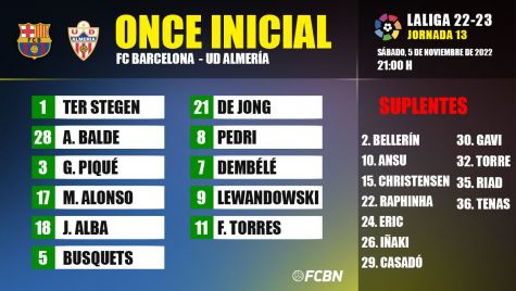 Piqué es el gran protagonista de este partido contra el cuadro almeriense. Xavi Hernández ha tenido muy pocas dudas con respecto a su alineación y ha introducido novedades, como está acostumbrando en las últimas semanas. El egarense recuperó de la enfermería a Andreas Christensen, lesionado a principios de octubre, y también a Eric García, quien sufrió molestias en la visita a Mestalla pero ya se ha recuperado.