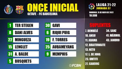- XI del FC Barcelona: Ter Stegen; Dani Alves, Mingueza, Lenglet, Balde; Busquets, Gavi, Riqui Puig; Ferran, Aubameyang y Memphis.