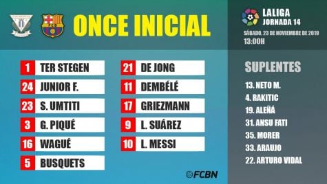 Leo Messi volverá a ser titular después de haberse consolidado como máximo goleador del equipo en un gran estado de forma, y la talentosa plantilla del FC Barcelona permitirá sacar un equipo lo suficientemente válido como para dominar de principio a fin el partido, con Dembélé en el once. No se pensará en el partido del próximo miércoles en Champions League, ante el Borussia Dortmund, hasta que no se certifique la victoria en Butarque.