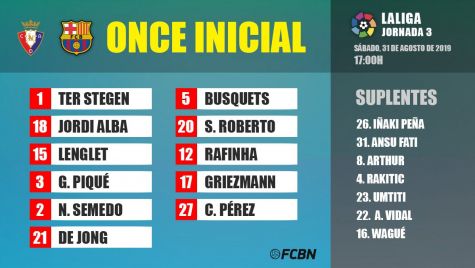 El entrenador del FC Barcelona, Ernesto Valverde, ha revelado ya la alineación con la que se enfrentará a Osasuna. Este es el XI del Barça: Ter Stegen; Semedo, Piqué, Lenglet, Jordi Alba; Busquets, De Jong, S. Roberto; Rafinha, Griezmann y Carles Pérez