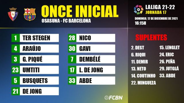 - XI del FC Barcelona: Ter Stegen; Araujo, Piqué, Umtiti; Busquets, De Jong, Nico, Gavi; Dembélé, Luuk de Jong y Ez Abde.
