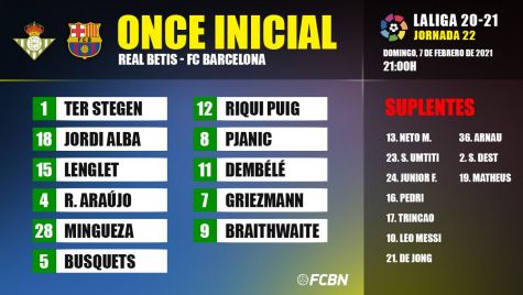 - XI del FC Barcelona: Ter Stegen; Mingueza, Lenglet, Araújo, Jordi Alba; Busquets, Pjanic, Riqui Puig; Dembélé, Griezmann y Braithwaite.