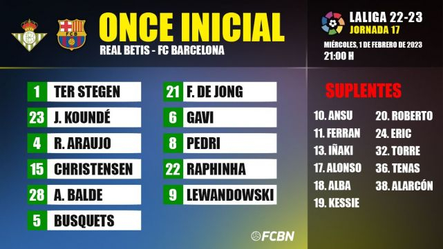 Xavi Hernández ya ha revelado la alineación con la que el FC Barcelona enfrentará al Real Betis en el Benito Villamarín, por la jornada 17 (atrasada) de LaLiga Santander 2022-2023. Este es el XI del Barça: Ter Stegen; Koundé, Araújo, Christensen, Balde; Sergio, De Jong, Gavi, Pedri; Raphinha, Lewandowski.