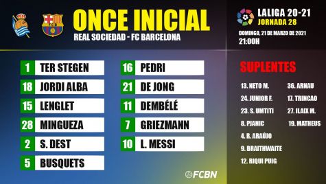 - XI del FC Barcelona: Ter Stegen; S. Dest, Lenglet, Mingueza, Jordi Alba; Busquets, De Jong, Pedri; Messi, Dembélé y Griezmann.