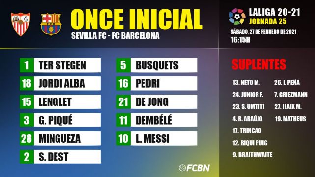 - XI del FC Barcelona: Ter Stegen; S. Dest, Piqué, Lenglet, Mingueza, Jordi Alba; Busquets, De Jong, Pedri; Messi y Dembélé.