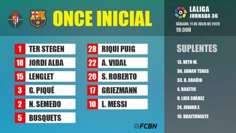 - XI del FC Barcelona: Ter Stegen; Semedo, Piqué, Lenglet, Jordi Alba; Busquets, Riqui Puig, A. Vidal, S. Roberto; Messi y Griezmann.