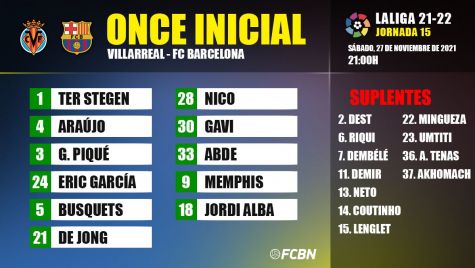 - XI del FC Barcelona: Ter Stegen; Araujo, Piqué, Eric; Busquets, De Jong, Nico, Gavi; Ez Abde, Memphis y Jordi Alba.