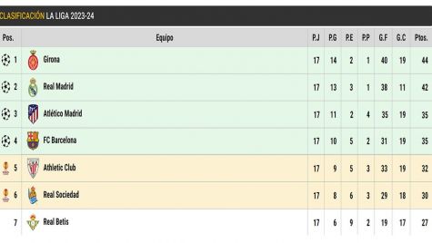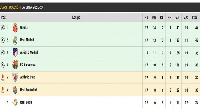 La clasificación completa de LaLiga en la jornada 17