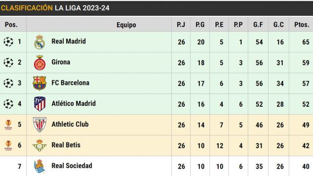 El 'top 10' de la clasificación la cierran Betis (42), Real Sociedad (40), Las Palmas (36), Valencia (36) y el Getafe (34). En la mitad de la tabla aparecen Osasuna (33), Alavés (29), Villarreal (29) y Rayo Vallecano (25). Sevilla (24), Mallorca (24) y RC Celta (21) están en la zona baja, pero por ahora a salvo. En las posiciones de descenso, finalmente, se mantienen Cádiz (18), Granada (14) y Almería (9) tras su empate contra el Atlético.