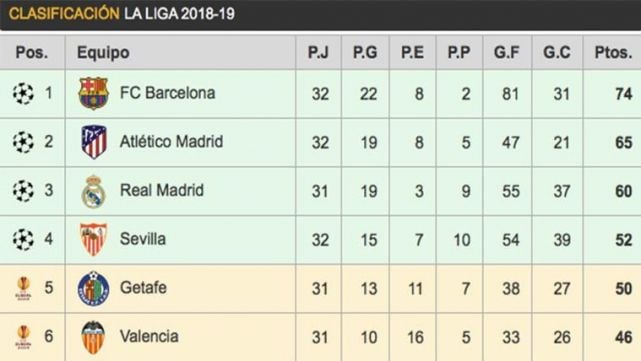 Ahora, el FC Barcelona sigue mandando con puño de hierro en el liderato (74 puntos), aunque el Atlético de Madrid recorta ligeramente las diferencias y se coloca nueve puntos por debajo de los blaugrana. Mal menor para el FC Barcelona, teniendo en cuenta que sumando los mismos puntos que el Atlético de Madrid, en las próximas tres jornadas, logrará ser campeón de forma matemática.