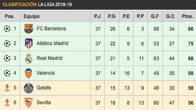 Otro foco de atención importante en la clasificación liguera es la lucha por el cuarto puesto. El Sevilla empató en el Wanda Metropolitano frente al Atlético de Madrid (1-1), y se mantiene todavía en la lucha por la cuarta plaza a falta de una jornada. Con 56 puntos, está a dos de Getafe y Valencia. Los chés ocupan ahora la plaza europea por mejor 'average' con respecto al Getafe, aunque todo se decidirá en la jornada 38.