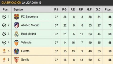Así queda la clasificación de LaLiga Santander 2018-19 tras la jornada 37