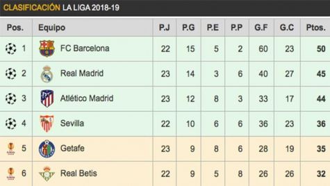 Bastante más lejos ha quedado ya el Sevilla, que tiene que jugar también este domingo frente al Eibar pero, con 36 puntos, está muy lejos de los 50 que ostenta el FC Barcelona a falta de la disputa de la respectiva jornada 23 contra el Athletic de Bilbao.