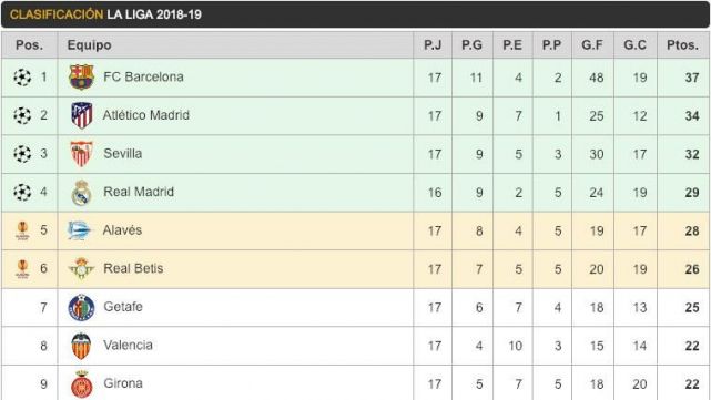 El Barça es líder y mantiene tres puntos de renta, aunque saca más distancia al tercer clasificado. 2019 continuará con la carrera, que pondrá a los de Ernesto Valverde cara a cara con el Getafe (en el Coliseum Alfonso Pérez) y se estrenará con un cruce vibrante entre andaluces y madrileños en el Ramón Sánchez Pizjuán.