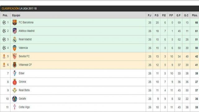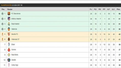 CLASIFICACIÓN ZONA ALTA DE LALIGA SANTANDER 2017-18: