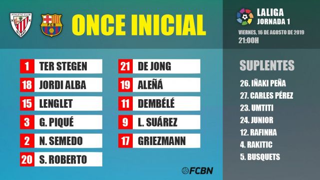 El FC Barcelona ha dado a conocer la alineación con la que se enfrentará al Athletic Club en San Mamés. Este es el XI del Barça: Ter Stegen; Semedo, Piqué, Lenglet, Jordi Alba; S. Roberto, Aleñá, De Jong; Dembélé, Griezmann y Suárez