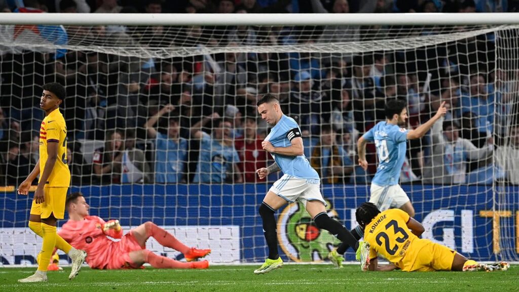 En la primera acción de peligro tras el descanso, el capitán gallego aprovechó un despiste defensivo azulgrana para, tras una combinación entre Larsen y Mingueza por derecha, aprovechar el gran pase del ex lateral del Barça para rematar totalmente solo en la frontal del área. Por suerte para el '10', el disparo se desvió en Jules Koundé, dejando sin oportunidades a un Ter Stegen que ya se había jugado hacia su mano derecha.