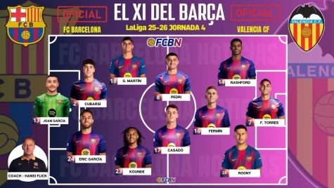 FC Barcelona y Valencia se enfrentan por la jornada 4 de LaLiga EA Sports 2025/26 en el Estadio Johan Cruyff. El conjunto azulgrana llega al choque con cinco bajas por lesión y Hansi Flick vuelve a sorprender con un ataque inédito, incluyendo al debutante Roony Bardghji en el lugar de Lamine Yamal.