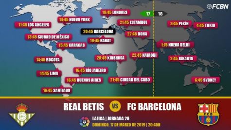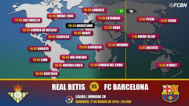 ¿Cuándo y dónde ver el partido Betis-FC Barcelona? Repasamos la guía internacional con los horarios y los canales de televisión que retransmiten en directo y online la jornada 28 de LaLiga Santander 2018-2019. En España, puedes ver el partido el domingo 17 de marzo a las 20:45 horas