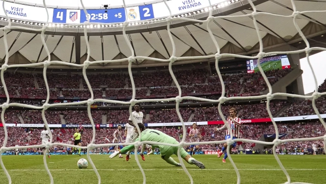 El '19' pateó de derecha bien ajustado al palo, superando la estirada de Thibaut Courtois. Con el 4-2, el Atlético se replegó en campo propio para sostener la ventaja. En el descuento, Antoine Griezmann hizo el quinto, definiendo ante la salida del belga un pase filtrado del recién ingresado Álex Baena.
