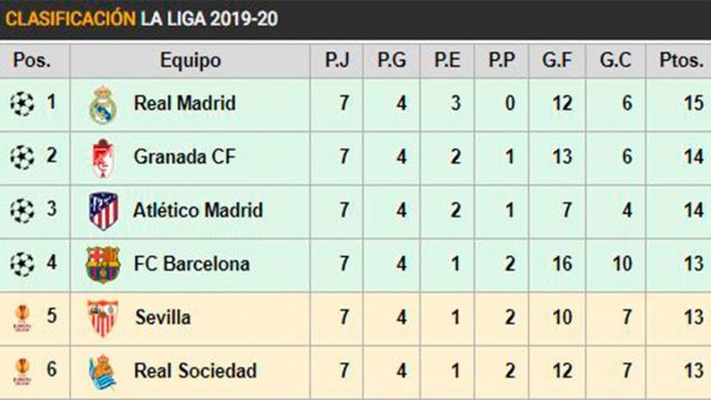 Ya ha finalizado la jornada siete de LaLiga y no hay cambios muy reseñables de posición en los primeros puestos de la clasificación. El Real Madrid sigue líder, pero el FC Barcelona le ha recortado dos puntos tras el empate de los blancos ante un Atlético, que a su vez es tercero y sigue a un punto del liderato. El Granada es segundo por diferencia de goles y volvió a ganar una semana más para seguir siendo el equipo revelación de LaLiga.