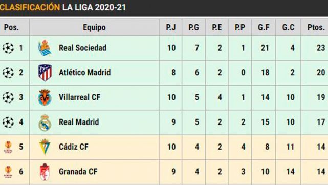 El Atlético de Madrid y la Real Sociedad han sido sin duda los grandes vencedores de esta jornada 10. El conjunto rojiblanco superó al FC Barcelona en el Wanda Metropolitano por 1-0 este pasado sábado y ya suma 20 puntos. Por su lado, los 'txuri-urdin' ganaron en el domingo al Cádiz por 0-1 y siguen comandando la clasificación de LaLiga con 23 puntos. Con estos resultados, los culés se quedan undécimos en la clasificación, con solo 11 puntos. Por otro lado, el Real Madrid tropezó en Villarreal (1-1) y sigue cuarto.