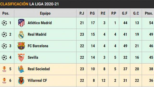 La jornada 23 terminó sin ningún cambio en los primeros puestos de la clasificación de LaLiga. Barça, Madrid y Atlético ganaron sus partidos, igual que el Sevilla, y los cuatro siguen afianzados en los puestos Champions