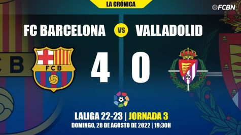 Un FC Barcelona sin oposición se ha quedado con los tres puntos en la visita del Valladolid al Spotify Camp Nou. Los goles de Robert Lewandowski (2), Pedri González y Sergi Roberto han certificado la segunda victoria consecutiva de los blaugrana en LaLiga Santander 2022-23 en un partido en el que la superioridad en todos los sectores del campo ha sido más que evidente y en la que el Barça se ha sentido dueño y señor en su campo.