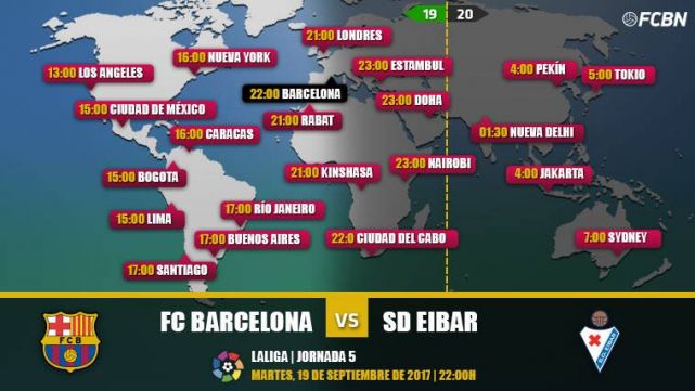 Fútbol Club Barcelona y Sociedad Deportiva Eibar se enfrentan en el Camp Nou, el martes 19 de septiembre a las 22:00 horas. El encuentro corresponde a la jornada 5 de la Liga Española de Fútbol 2017-2018.