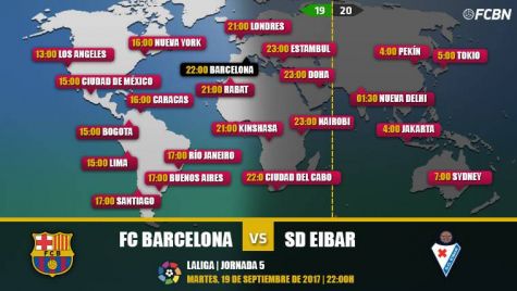 Además, diferentes canales internacionales ofrecen ver el partido a través de sus plataformas (señal de TV en abierto o de pago según país). Estos son los horarios mundiales y los canales de televisión que retransmiten en vivo y online el encuentro FC Barcelona-Eibar, pero si en tu país no se emite lo puedes seguir en directo aquí.