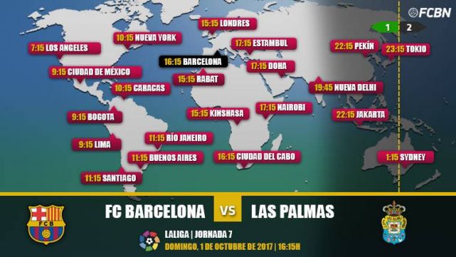 Fútbol Club Barcelona y UD Las Palmas se enfrentan en el Camp Nou, el domingo 1 de octubre a las 16:15 horas. El encuentro corresponde a la jornada 7 de la Liga Española de Fútbol 2017-2018.