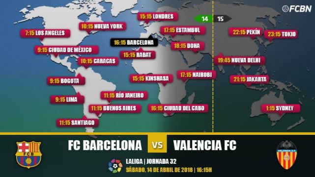 FC Barcelona y Valencia juegan este sábado 14 de abril, a las 16:15 horas, en el Camp Nou. El encuentro corresponde a la 32ª jornada de LaLiga Santander 2017-2018 y enfrenta al Barça de Ernesto Valverde, líder del campeonato con 79 puntos, contra el Valencia de Marcelino García Toral, tercer clasificado con 65 puntos. VER CLASIFICACIÓN LALIGA SANTANDER