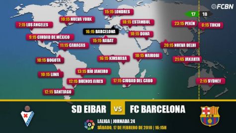 Eibar y Fútbol Club Barcelona se enfrentan el sábado 17 de febrero, a las 16:15 horas, en el Estadio de Ipurua. El encuentro corresponde a la 24ª jornada de LaLiga Santander 2017-2018 y enfrenta al Barça, líder del campeonato con 59 puntos, contra el Eibar, séptimo clasificado con 35 puntos. VER CLASIFICACIÓN LALIGA SANTANDER