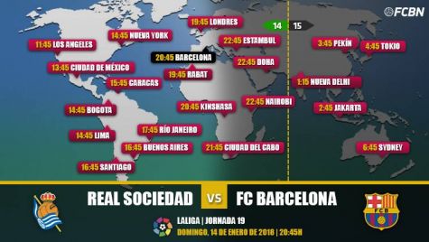 Real Sociedad y FC Barcelona se enfrentan el domingo 14 de enero a las 20:45 horas en el Camp Nou. El encuentro corresponde a la 19ª jornada de la Liga Española de Fútbol 2017-2018 y enfrenta al Barça, líder del campeonato con 48 puntos, contra la Real Sociedad, decimotercera clasificada con 23 puntos. VER CLASIFICACIÓN LA LIGA
