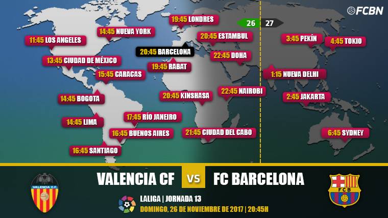 Valencia y FC Barcelona se enfrentan el domingo 26 de noviembre, a las 20:45 horas, en el Estadio de Mestalla. El encuentro corresponde a la 13ª jornada de la Liga Española de Fútbol 2017-2018 y enfrenta al Barça de Ernesto Valverde, líder del campeonato con 34 puntos, contra el Valencia entrenado por Marcelino, segundo clasificado con 30 puntos. VER CLASIFICACIÓN LA LIGA