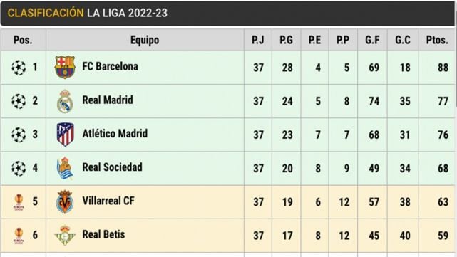 A falta de una jornada para el final, así están las cosas en LaLiga. El FC Barcelona tiene una diferencia de 11 puntos sobre el Real Madrid (88 vs 77). El Atleti tiene 76, por los 68 de la Real Sociedad. El 'top 10' lo cierran Villareeal (63), Betis (59), Osasuna (50), Athletic (50), Girona (49) y Rayo Vallecano (49). En la mitad de tabla aparece el Sevilla (49), Mallorca (47), Cádiz (41), Getafe (41), Valencia (41), Almería (40) y Celta (40). El Valladolid abre la zona de descenso con opciones de quedarse en Primera (39) con los ya descendidos (36) y Elche (24).