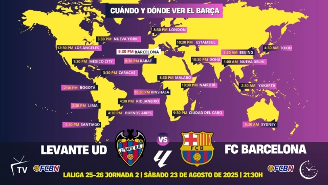 La jornada 2 de LaLiga EA Sports 2025/26 del FC Barcelona contra el Levante UD tiene horario canal de televisión confirmado y múltiples opciones para seguirlo online en streaming. Te contamos cómo y desde dónde podrás ver el el segundo partido del conjunto azulgrana en la Primera División española.