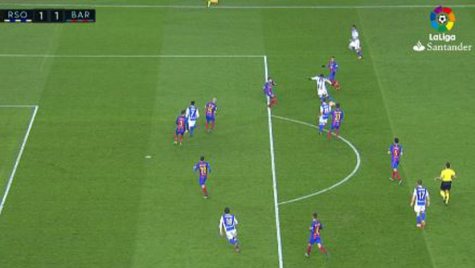 Anoeta vibró nuevamente con la Real Sociedad y empujó a los suyos a hacer todo lo posible por "machacar" a los de Luis Enrique desde el primer minuto. En el primer tiempo todo transcurrió con normalidad arbitral, aunque en el segundo acto el primer gol de la Real Sociedad bien podría haberse anulado por falta previa de Carlos Vela a Javier Mascherano, cuando el mexicano pugnó con el argentino y le derribó con un empujón, antes de que Willian José recogiera el rechace de la jugada para marcar.