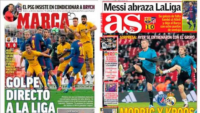 Los principales medios deportivos de la capital española, 'Marca' y 'AS', valoraron el triunfo del Barcelona como un "golpe" casi definitivo a LaLiga, gracias a la prodigiosa diana de falta directa conseguida por Leo Messi, la tercera consecutiva en las tres últimas jornadas de competición.