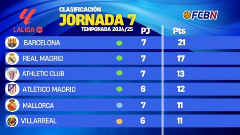 La séptima jornada de LaLiga 2024-25 nos deja al Barcelona de Hansi Flick como líder en solitario de la clasificación con 21 puntos, cuatro más que el Real Madrid