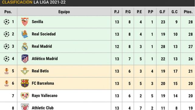 Los culés todavía están muy alejados del liderato. Después de su empate 'in extremis', el Sevilla dormirá líder con 28 puntos, los mismos que tiene la Real Sociedad, en la previa de su partido ante el Valencia de este domingo (21:00 horas). El Real Madrid alcanza la tercera plaza, a falta de disputar su choque contra el Granada (domingo, 16:15 h) y con 27 unidades. El Atlético, después de su triunfo sobre la hora, se queda en la cuarta posición con 26 puntos.