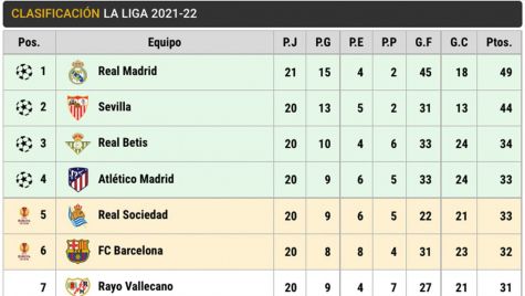 Por detrás está el Atlético de Madrid (33) tras su empate contra el Villarreal este domingo, seguido por la Real Sociedad (33), el Barça (32) y el Rayo Vallecano (31) para que el 'top 10' de la clasificación lo cierren el Villarreal (29), Athletic (28) y Valencia (28).