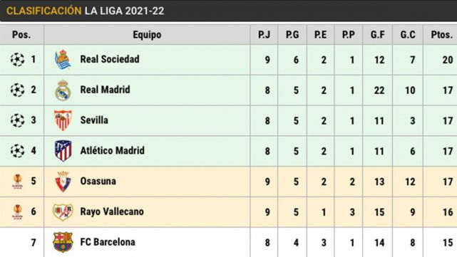El Barça está en la séptima posición de la tabla, a cinco puntos del liderato, ocupado en este momento por la Real Sociedad (20), que tiene un partido más que los culés. Los realistas vencieron por la mínica al Mallorca para asaltar el liderato, en un fin de semana en el que no jugó el Real Madrid (17), que le sigue en la clasificación.